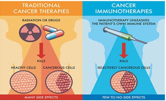 Immunotherapy is a biological therapy that bolsters the body's natural defences against cancer cells and infections. Conventional cancer treatment is associated with a high rate of adverse events, as it does not distinguish cancer cells from healthy cells. Immunotherapy, for example, has overcome this obstacle by training the patient's natural immune system to recognize and selectively kill cancer cells, resulting in a reduced number of manageable general side effects.