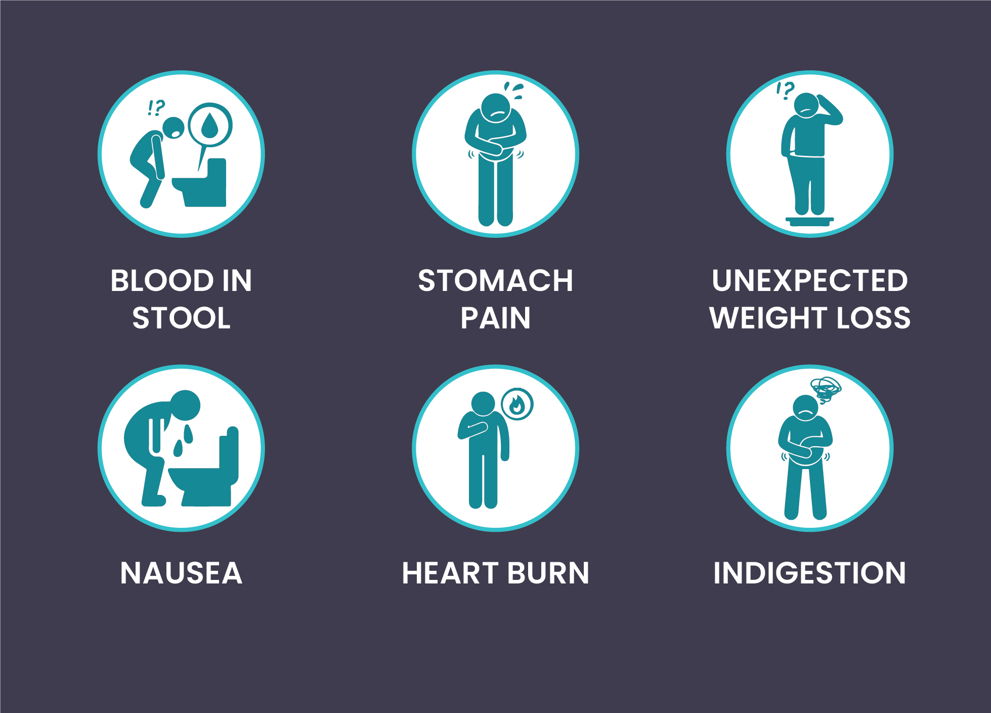 Sometimes cancer can grow in the stomach for a long time before it causes symptoms. Signs and symptoms of stomach cancer may include: