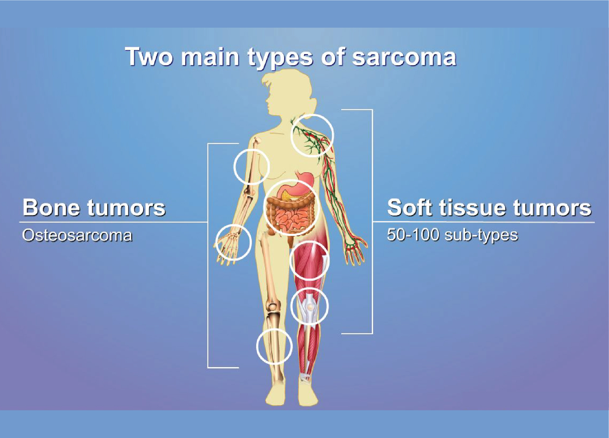Sarcomas are rare cancers that develop in the bones and soft tissues, including fat, muscles, blood vessels, nerves, deep skin tissues, and fibrous tissues.Sarcoma is a type of cancer that develops from transformed cells of the area of connective tissue. These tissues consist of bone, cartilage, fat, vascular, or hematopoietic tissues. The occurrence of sarcomas can happen in any of these types of tissues. Sarcoma can develop on any part of your body. And, it is a very different and rare type of cancer.